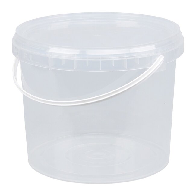 Runder, transparenter, Eimer inklusive Deckel mit einem Fassungsvermögen von 5 Litern. Der Eimer ist absolut flüssigkeitsdicht und wird mit einem Griff und einer Garantie für Erstbesitzer geliefert. Geeignet für den Lebensmittel- und Non-Food-Sektor. Lesen Sie mehr.