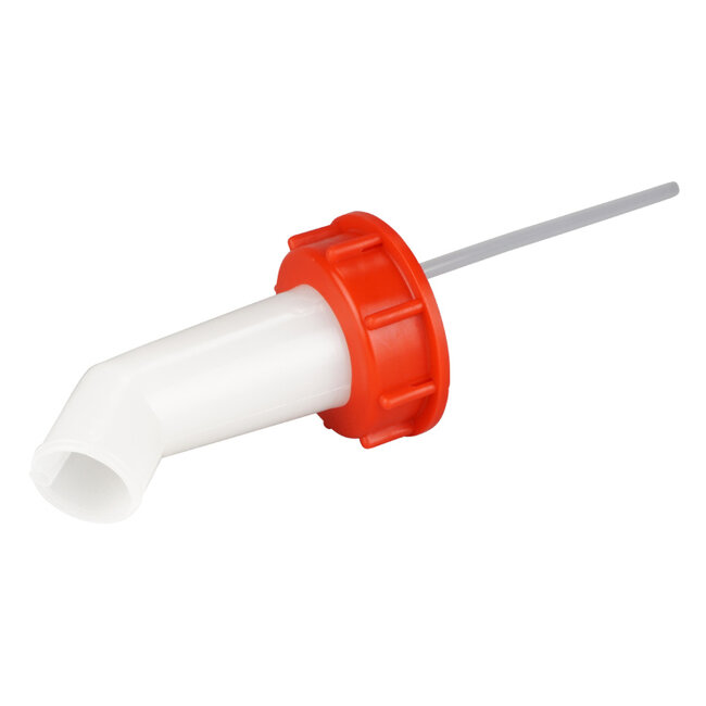 Schenktuit met brede uitloop voor stapelbare (UN) jerrycans met een DIN61 opening. Geschikt voor het uitschenken van zowel gevaarlijke vloeistoffen als levensmiddelen. De tuit heeft een uitloop van 30 mm en is voorzien van een beluchtingskanaal.